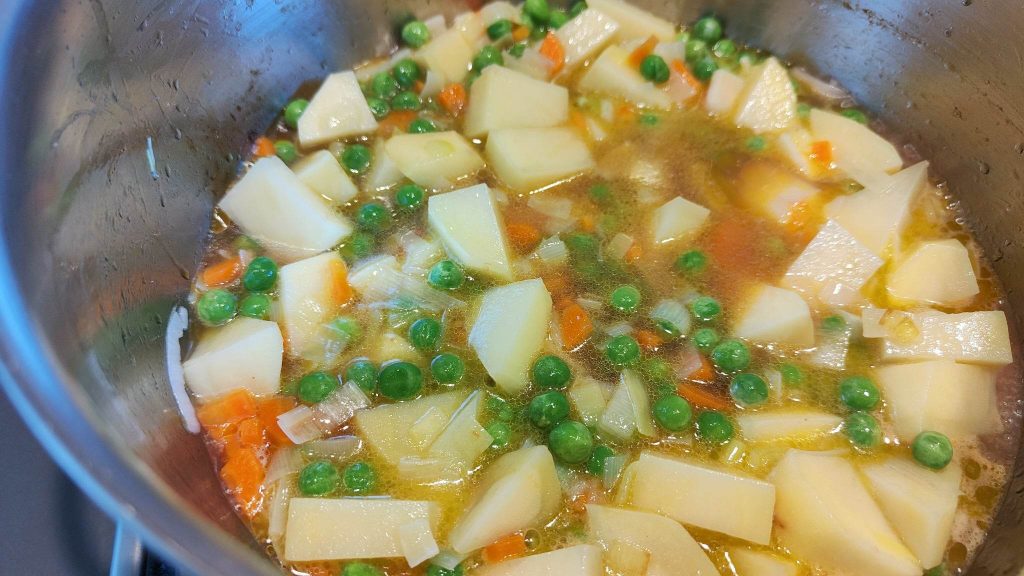 Ik noemde het eenvoudig maar rijk, omdat het is samengesteld uit eenvoudige en goedkope ingrediënten zoals de prei, de erwten, de aardappelen en de wortelen, maar het is rijk aan smaak.