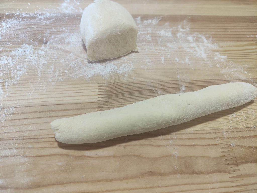 Bestuif het werkblad met bloem, verdeel het deeg om rolletjes te vormen.