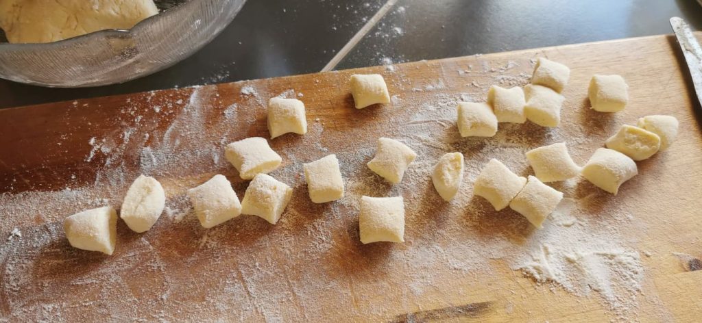 Vorm de gnocchi met je handen, vorm de klassieke streepjes die we afronden en met een mes snijden.