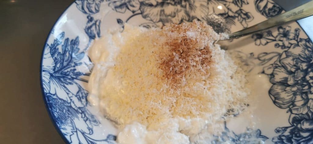 In een kom werken we de ricotta, uitgelekt van het serum, met de geraspte kaas, voeg muskaatnoot en zout toe en meng alles goed.