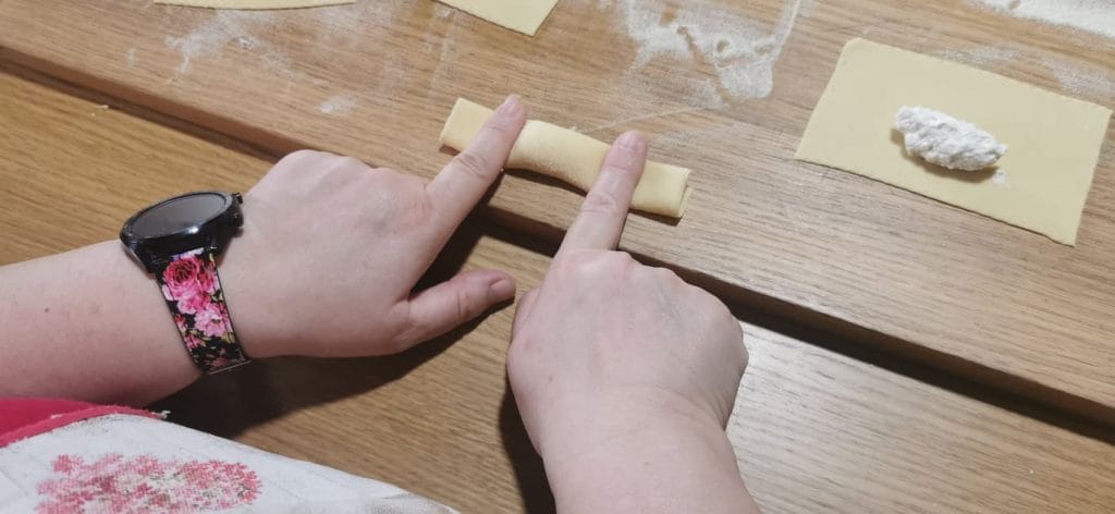 Knijp de twee uiteinden samen. (Vorm met je vingertoppen je gevulde pastasnoepjes).