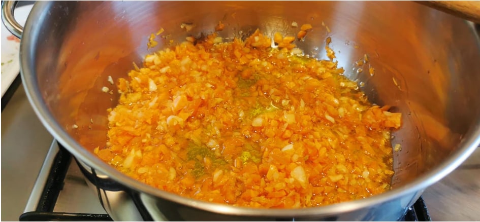 Wanneer de soffritto goudbruin is, voeg je het gehakt toe.