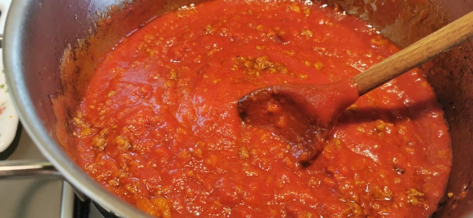 Verlaag het vuur tot het minimum, bedek de pan voor driekwart en laat ongeveer 2 / 3 uur koken. De saus moet heel zachtjes koken op laag vuur.