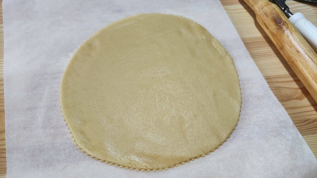 Rol tweederde van het deeg uit op bakpapier tot een schijf van 4/5 mm.
