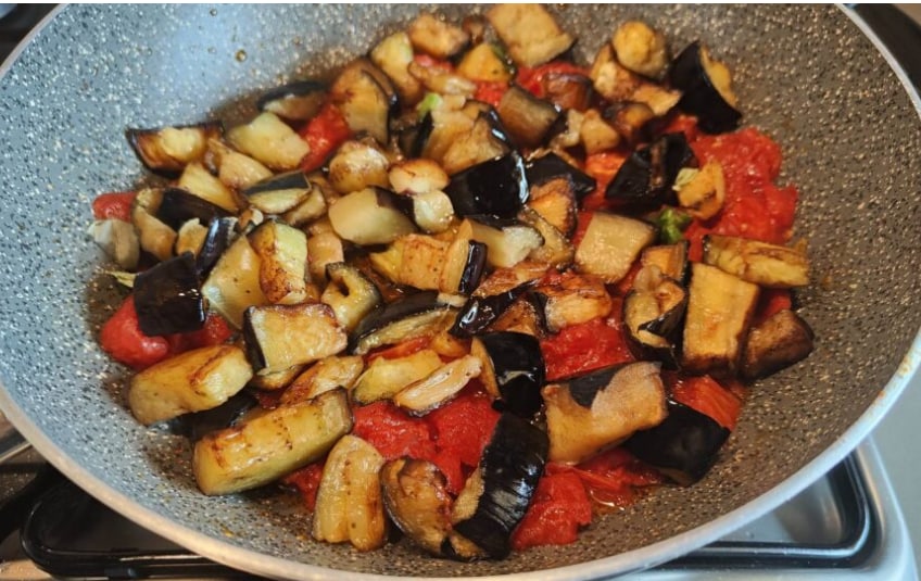 Enkele minuten voor het einde van de kooktijd voeg je de auberginesaus toe.