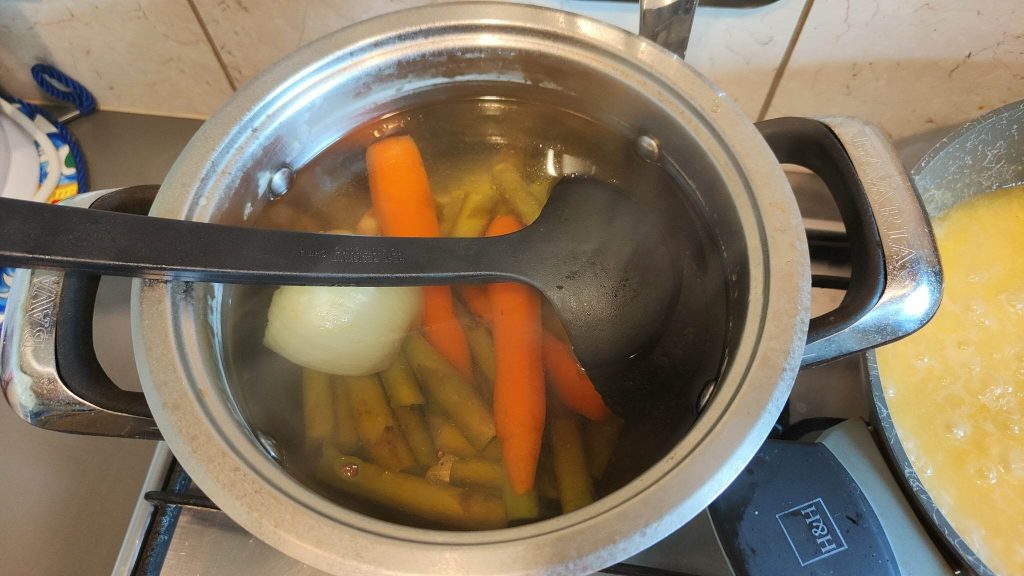 Breng in een ruime pan het water aan de kook, voeg de aspergerestjes, selderij, wortel, een kleine ui en een half theelepel zout toe.