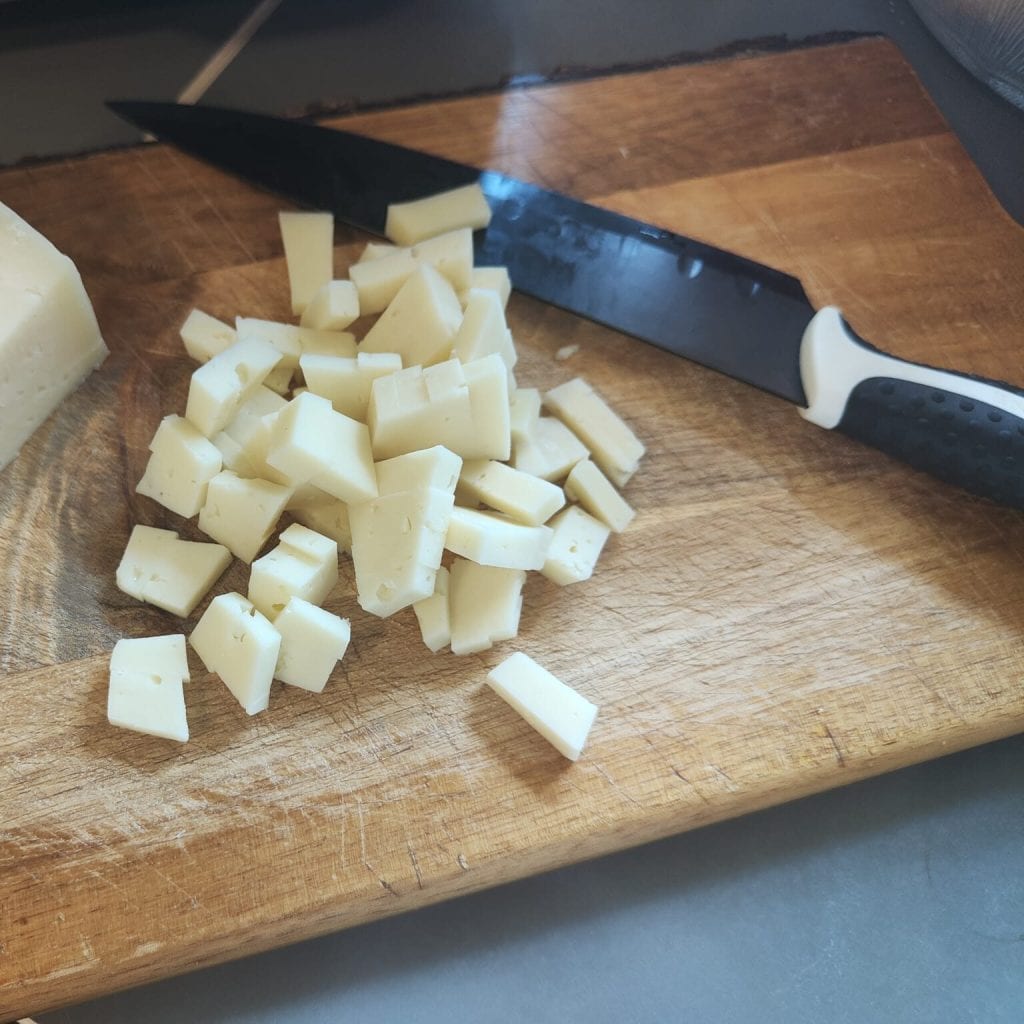 Snijd met het mes ook de taleggio in niet te grote blokjes.