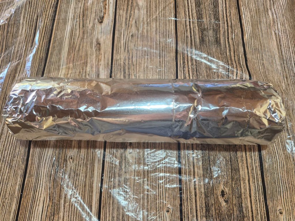 Wikkel de rol stevig eerst in bakpapier en daarna in aluminiumfolie: deze dubbele laag zorgt voor een perfecte cilindervorm.