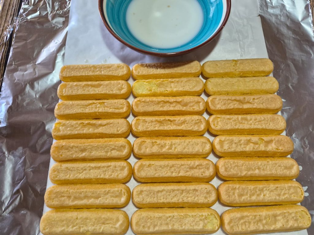 Doop de savoiardi één voor één kort in de melk met een snelle beweging.