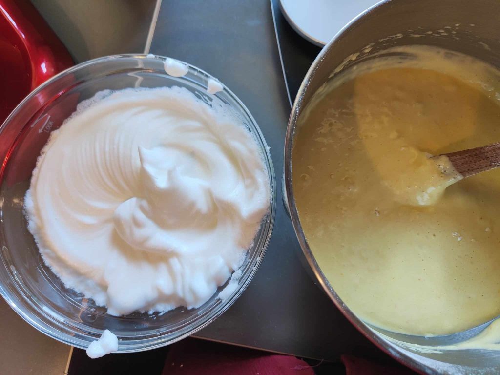• Op dit punt is het mengsel klaar, zodat je de stijf geslagen eiwitten kunt toevoegen.