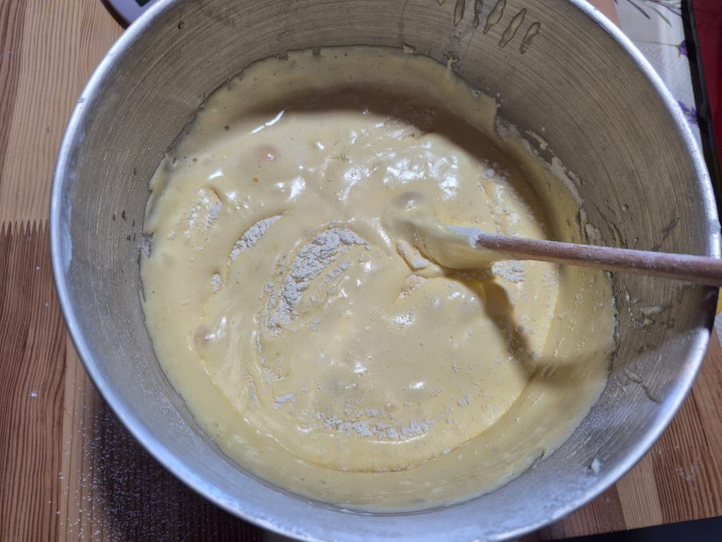 Zodra de bloem is toegevoegd, mix je zo min mogelijk en alleen met een spatel (bewegingen van onder naar boven). Te veel mengen ontwikkelt gluten en maakt de cake gomachtig of minder luchtig.
