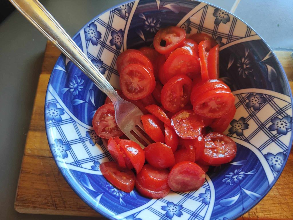 Snijd de cherrytomaatjes nu in schijfjes of partjes en doe ze in een grote schaal, en breng ze op smaak met zout, peper en olijfolie.
