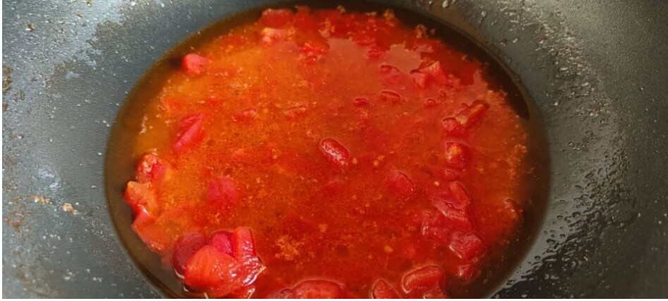 Bak de knoflook met een stukje peper en voeg gewassen en gepelde tomaten toe die in stukjes zijn gesneden
