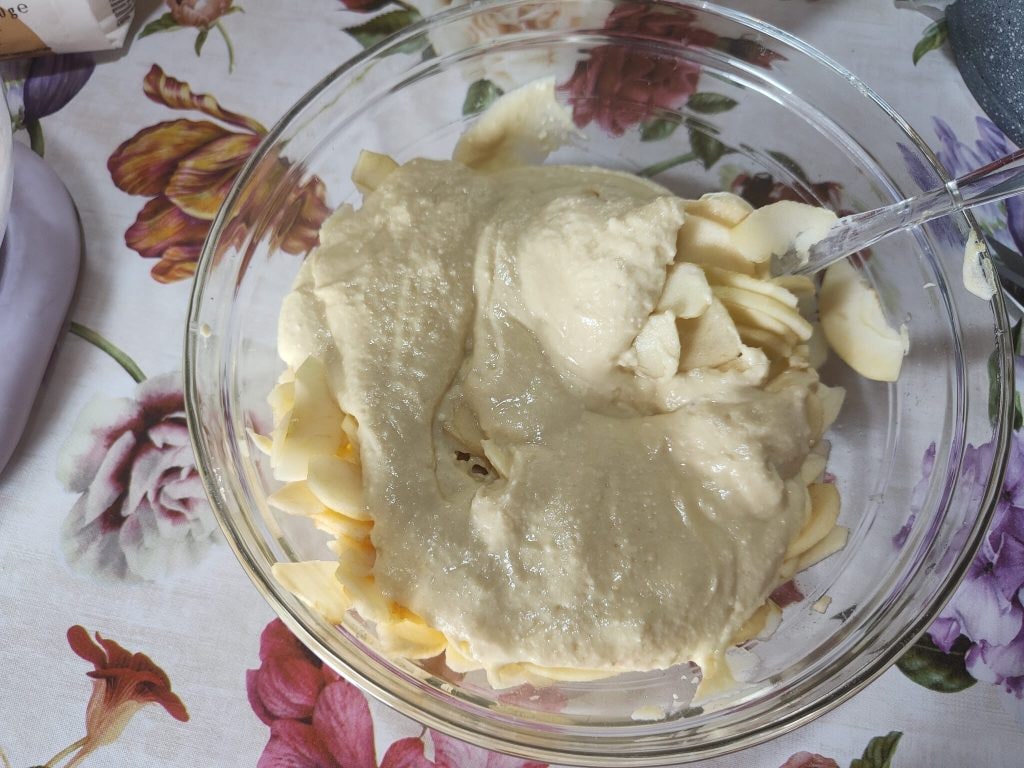 Giet op dit punt de appels in het eerder bereide beslag en meng met een spatel om ze goed met het beslag te omwikkelen.