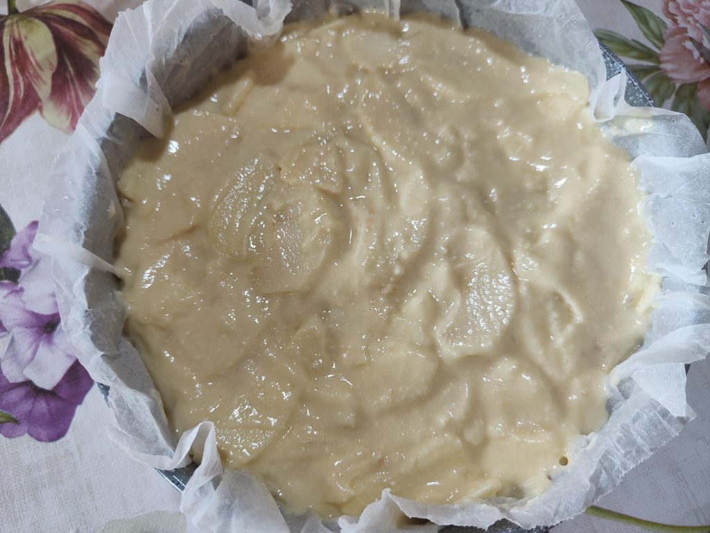 Aan de vele dunne plakjes appel wordt een licht deeg toegevoegd, gemaakt met eieren en ricotta en heel weinig bloem.