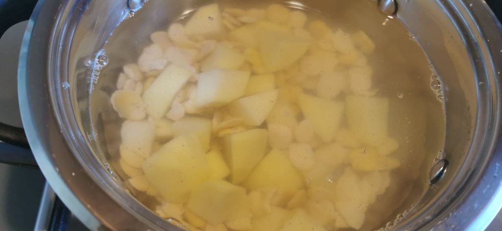 Halverwege de kooktijd voeg je een in blokjes gesneden aardappel en een fijngesnipperde ui toe.