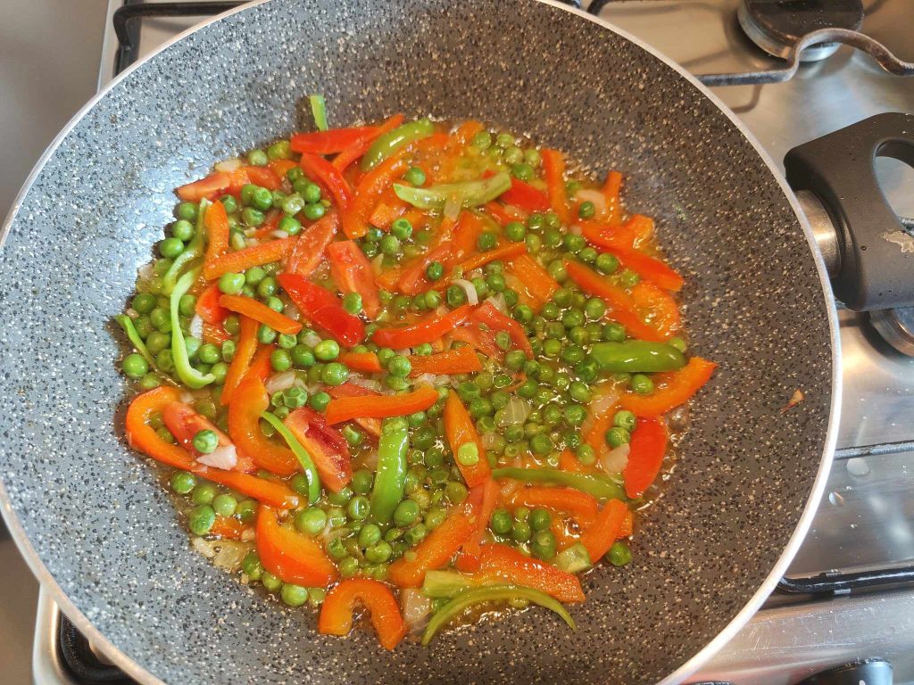Voeg diepvrieserwten en de eerder gewassen, gedroogde en in blokjes gesneden rode en groene paprika’s toe.