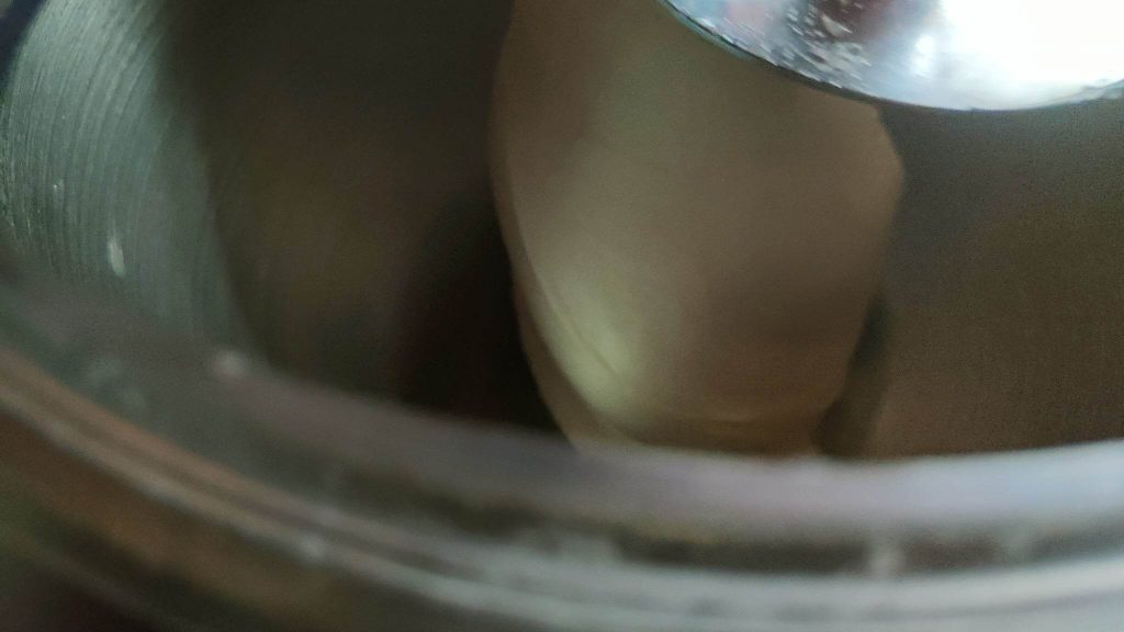 • Laat de keukenmachine voorzichtig werken (gebruik de knoppen 2/3 afwisselend) totdat het deeg loskomt van de zijkanten zoals op de foto.