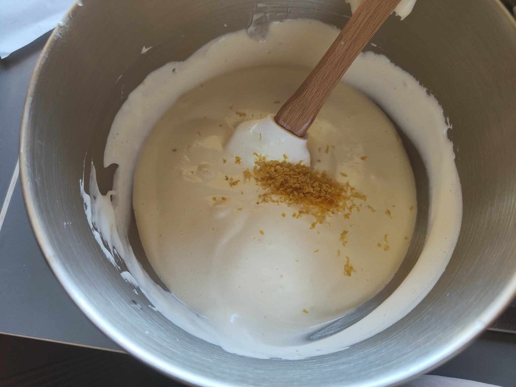 Voeg de olie in een dunne stroom toe, dan de yoghurt en de geraspte schil en het sap van de citroen. Gebruik op dit punt de spatel en demonteer het mengsel niet.