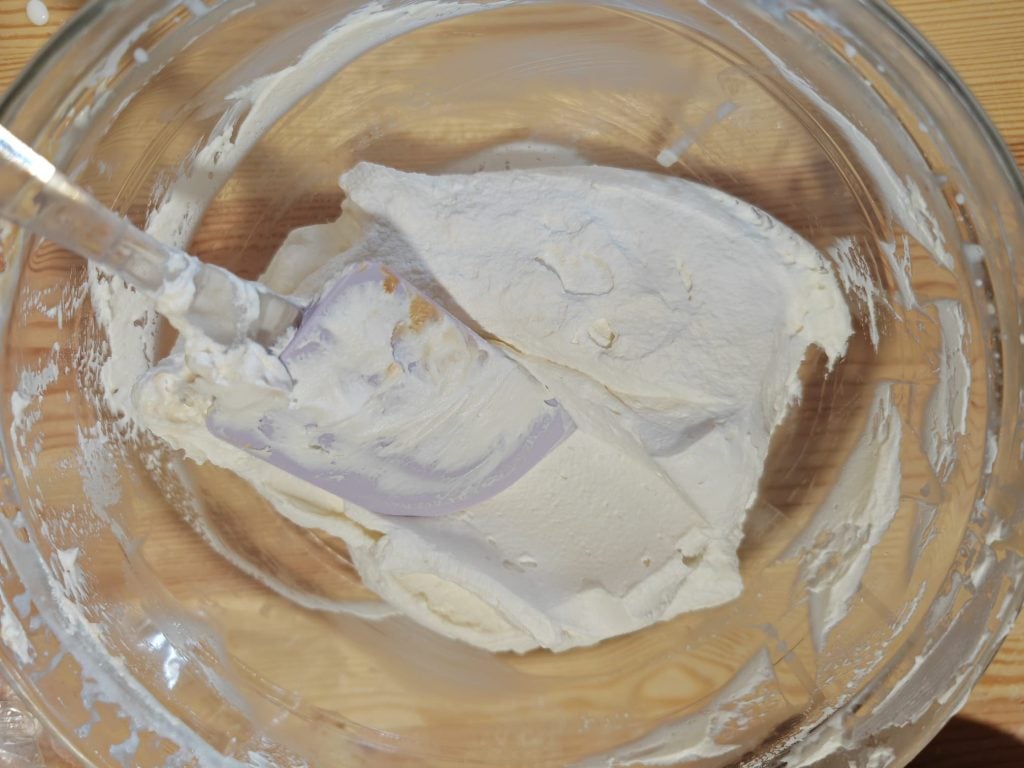Haal de room uit de koelkast en meng deze voorzichtig met een spatel door de mascarponecrème, met bewegingen van beneden naar boven, zodat het niet instort.