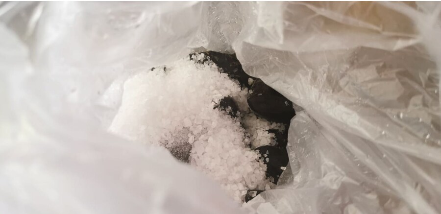 (Doe enkele mosselen in een plastic zak, voeg er veel grof zout aan toe en sluit de zak. Doe de gesloten zak in een andere zak.