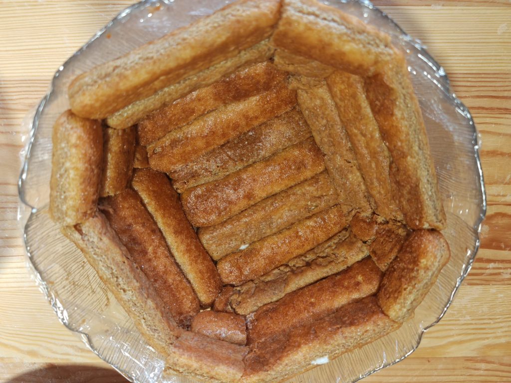 Dompel de lange vingers in de koffie, net genoeg om ze een beetje zacht te maken, en plaats ze op het hele oppervlak van de vorm.