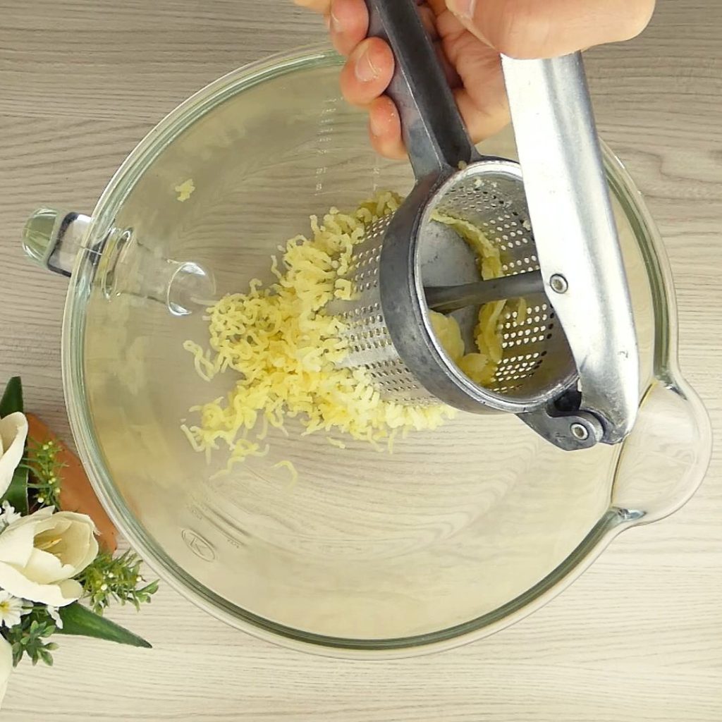 Giet ze af en laat ze een beetje afkoelen, pel ze dan en stamp ze met een aardappelstamper, verzamel de puree in een ruime kom, omdat het deeg moet rijzen en veel in volume zal toenemen.