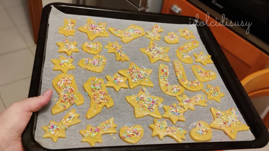 • Ik leg ze dan op een bakplaat bekleed met bakpapier, bestrijk ze met losgeklopt eiwit en bedek ze als laatste met gekleurde suikerhagelslag.