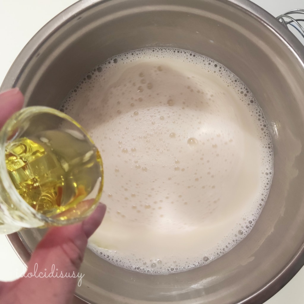 Voeg de eieren toe en meng met de handgarde tot je een gladde en homogene room krijgt. Houd deze apart tot het moment dat je het in de taart gaat gieten.