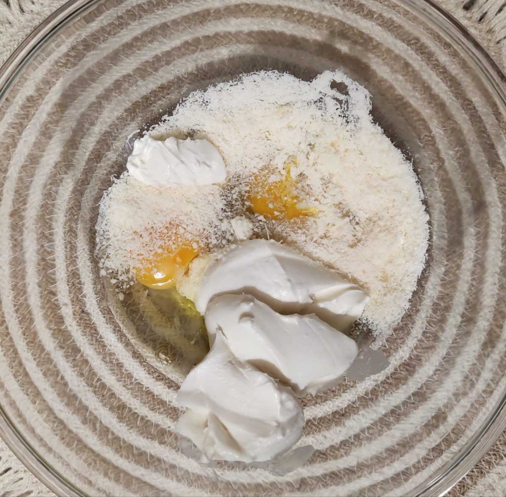 Doe in een kom de eieren, Parmezaanse kaas, mascarpone, een snufje zout en bieslook, meng alles met een vork tot een crème, en voeg het pompoenmengsel toe. Meng alles samen.