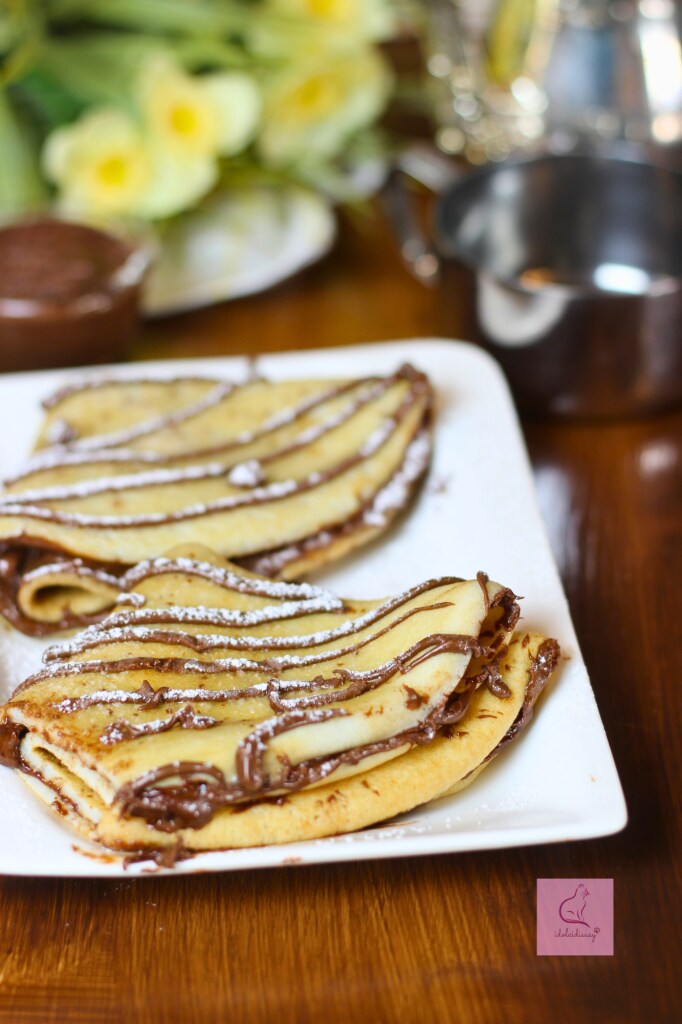 Eenmaal gaar, leg ik ze op een bord, besmeer ze voor de helft met Nutella en vouw ze in vieren en bestrooi ze met een beetje poedersuiker.