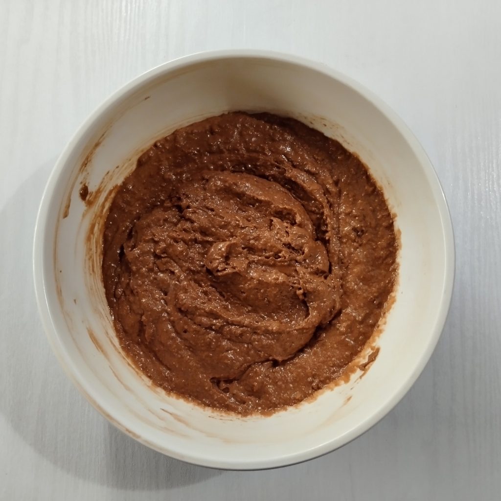 Ik voeg de likeur en de gesmolten chocolade toe aan de opgeklopte dooiers en werk met de elektrische kloppers. Ik voeg het amandelmeel toe en meng met de spatel, het deeg zal behoorlijk dik zijn.