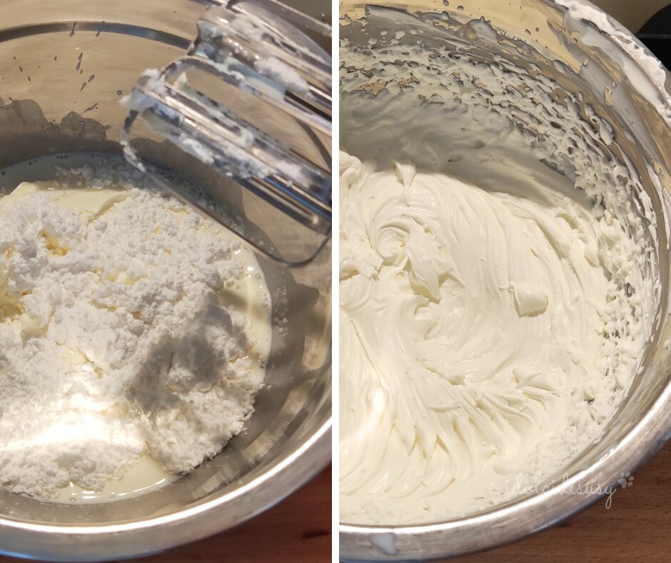 Ik houd de kom en de garde een half uur in de vriezer, zodat de room sneller stijf wordt. Giet de slagroom, voeg de smeerbare kaas en de poedersuiker toe en begin met de elektrische garde te kloppen, zodra de room stevig en homogeen is, stop de garde.