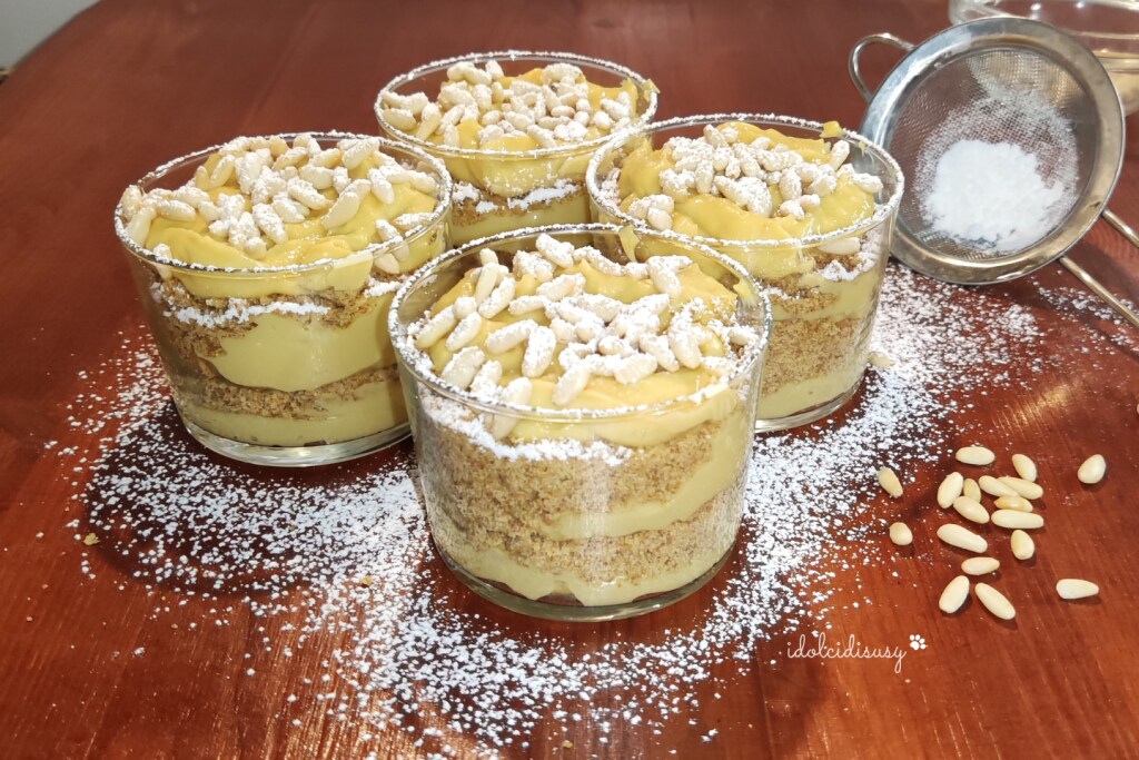 Romige grootmoeders taart in een glas, een heerlijk, smakelijk en makkelijk te bereiden dessert met een lepel. Dit eenvoudige en snelle recept wordt gemaakt met verkruimelde koekjes, fluweelzachte banketbakkersroom en knapperige pijnboompitten. Een perfect dessert om na het avondeten te serveren, ook ideaal voor familielunches of wanneer je jezelf wilt verwennen met iets bijzonders.