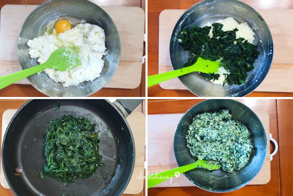 • Ik kook de spinazie in kokend water en knijp ze goed uit. Ik heb de bevroren gebruikt 😜. In een koekenpan laat ik een sjalotje met een beetje extra vergine olijfolie verwelken, ik voeg de spinazie toe en laat ze op smaak komen met een snufje zout. Ik laat het afkoelen.