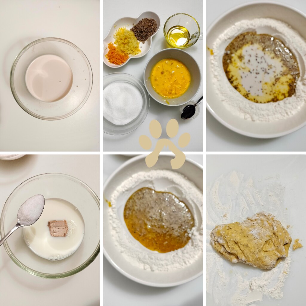 In een klein kommetje giet ik de lauwe melk, een theelepel suiker uit het totaal van de recept en de bakkersgist, ik roer met een theelepel en zet opzij. In een kom breek ik de eieren, klop ze lichtjes op met een vork en voeg de olie, suiker en aroma’s toe, meng goed om ze te laten samenkomen. Ik doe de bloem in een grote kom, maak met mijn vuist de klassieke fontijn en giet het eimengsel en de in melk opgeloste gist erin, begin te mengen met een handgarde en draai dan alles om op het werkblad om met de hand te kneden.
