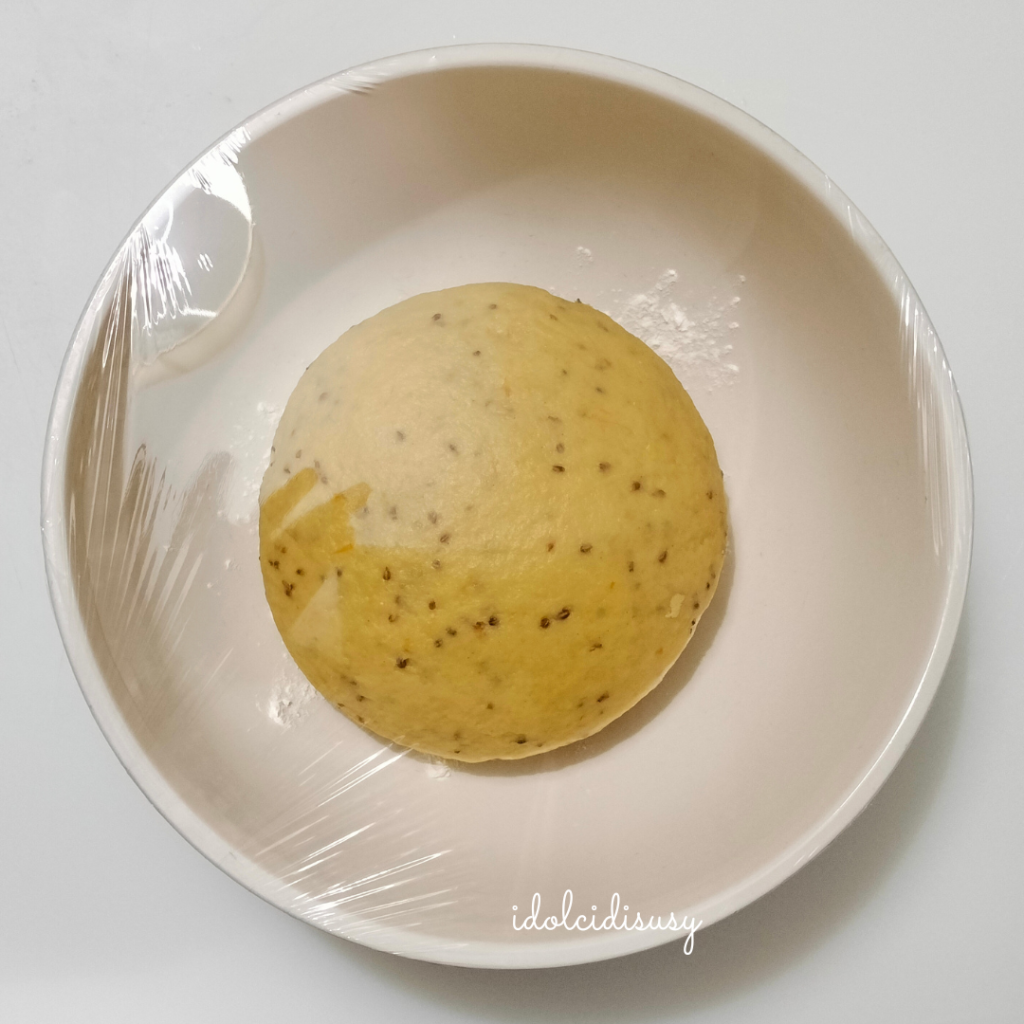 Ik leg het deeg in de kom, dek het af met plasticfolie en laat het ongeveer 3 uur rijzen, totdat het in volume is verdubbeld.
