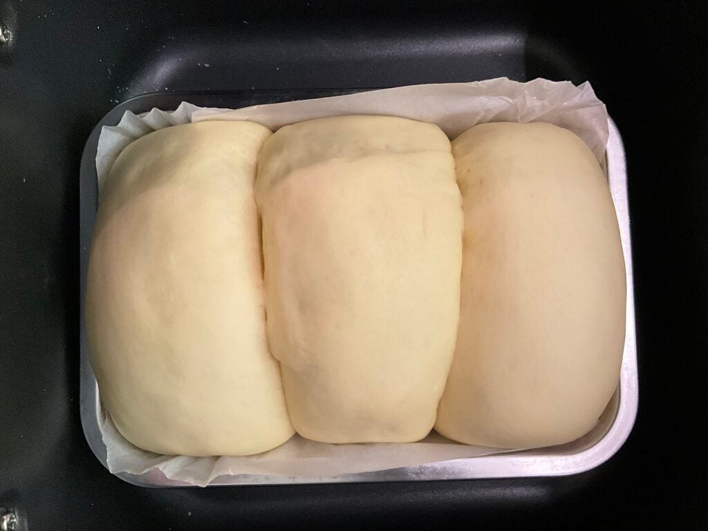Na 15 minuten verzamel je het deeg met een spatel uit de kom. Je zult merken dat het erg zacht en warm is. Vet je handen in met olie om te voorkomen dat het blijft plakken. Je kunt het nu in drie gelijke stukken verdelen, een vouw geven en drie balletjes vormen. Plaats ze horizontaal uitgerekt om de vorm te vullen.