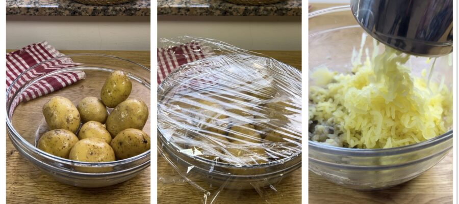 Doe intussen de aardappelen in een pan, bedek met water, voeg zout toe en kook 35-40 minuten vanaf het koken of totdat ze zacht zijn als je er met een prikker in steekt. Giet af en laat ze iets afkoelen. Of doe zoals ik: leg ze gewassen in een kom, giet een half glas water erbij en dek luchtdicht af met folie. Kook in de magnetron op 750W gedurende 20 minuten, haal eruit en laat iets afkoelen. Stamp de aardappelen fijn en voeg ze toe aan dezelfde kom waar je de goed uitgelekte aubergine hebt gedaan.