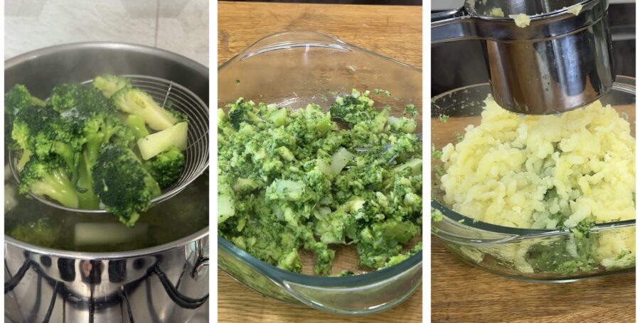 Verdeel de roosjes van de broccoli van elkaar, verwijder het hardste deel van de steel met een mes, spoel ze af en dompel ze in kokend gezouten water. Kook tot ze heel zacht zijn, giet goed af, doe ze in een kom, laat iets afkoelen en stamp ze zeer fijn met een vork. Voeg ook de geprakte aardappelen toe; als je een aardappelpers gebruikt, hoef je ze niet te schillen omdat de schil in de pers achterblijft.
