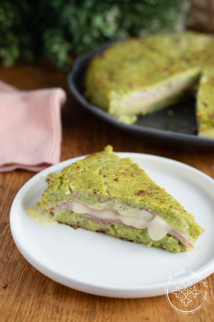 Aardappel- en broccolitaart in de pan met ham en mozzarella, een smakelijk recept, redder van het avondeten en koelkast-opruimer, halverwege de Tortini di patate e broccoli en de Torta di patate in padella con spinaci e mozzarella. Eenvoudig en lekker zoals alle recepten met aardappelen of de recepten met broccoli, is dit broccoli- en aardappelsformato perfect voor een goedkoop en snel avondeten en kan het in de pan worden gebakken zoals ik deed of in de oven.