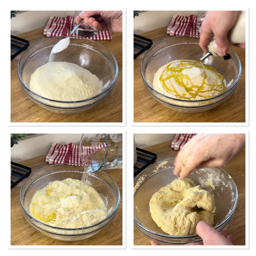 Doe de bloem in een kom, voeg het zout, de olie en het water beetje bij beetje toe (bij bloem type 0 heeft u iets minder water nodig).