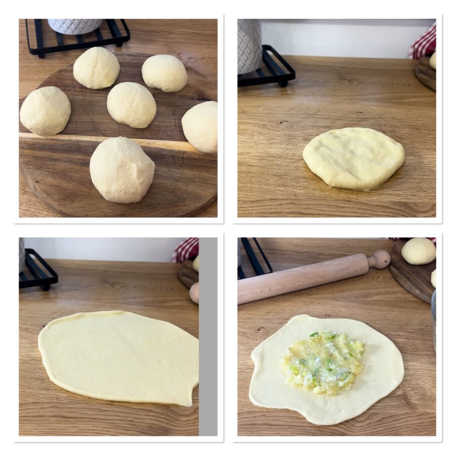 Rol of druk elk bolletje met een deegroller of met de hand uit tot een schijfje, vul het met de gestampte aardappelen en de kaas en vouw dicht als een pakketje door de randen naar het midden te brengen.