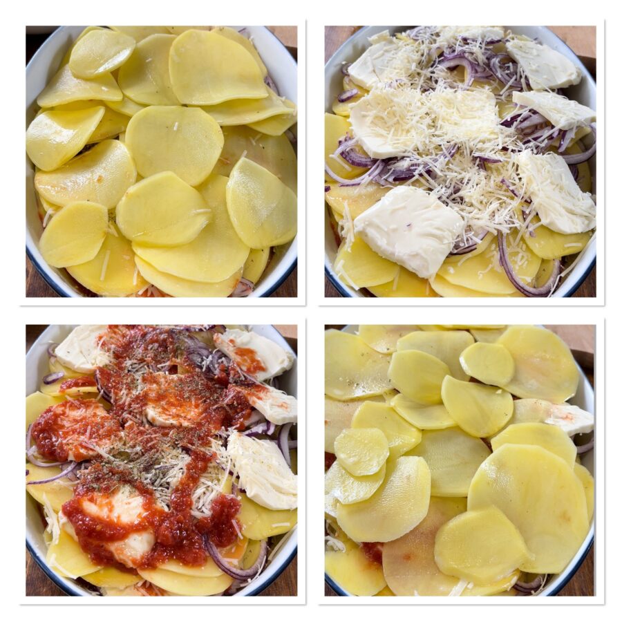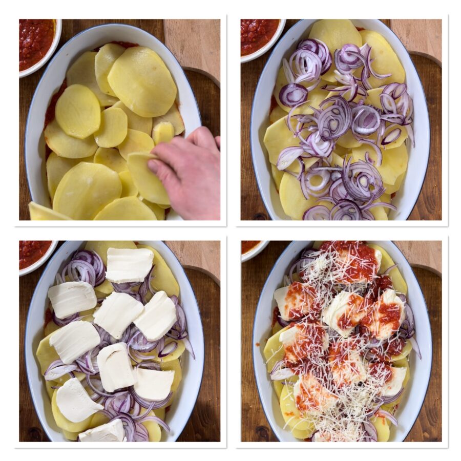 Aardappelen alla pizzaiola uit de oven met ui en mozzarella, een Siciliaans recept van mijn moeder.