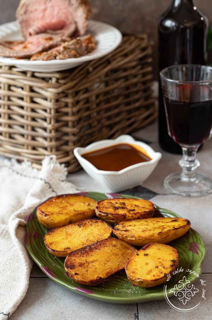 Voor dit bijgerecht heeft u gekookte aardappelen nodig. Als u niet weet hoe u ze moet koken, dompel ze dan onder in water en kook ze 30-35 minuten of totdat een prikker er gemakkelijk in gaat en ze zacht zijn. Neem het braadvocht van het vlees (als u het in de pan hebt aangebraden) en smelt daarin de boter; anders smelt u de boter direct. Leg er een takje rozemarijn bij, halveer de aardappelen, bij voorkeur zonder ze te schillen, en leg ze met de snijkant direct in de boter. Bak op hoog vuur zodat ze goed goudbruin worden. Breng op smaak met zout en serveer samen met roast beef en uw geroosterde vleesgerechten.