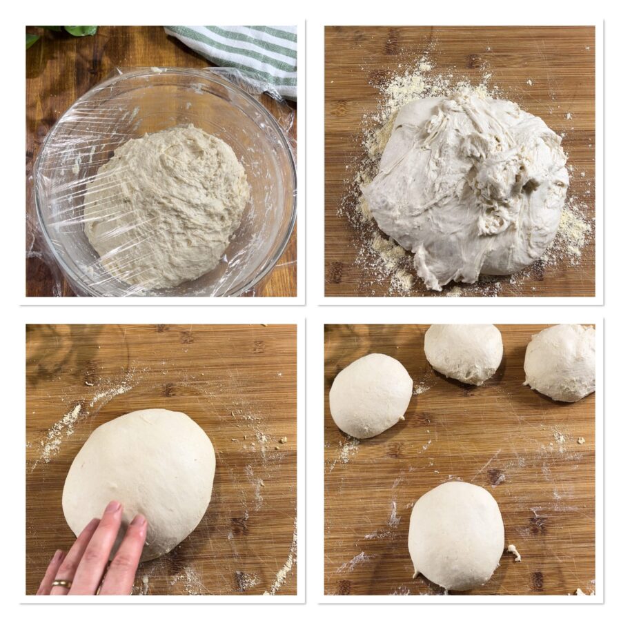 Bestuif het werkblad met bloem en keer het deeg erop. Kneed het een paar minuten tot je een glad, elastisch en homogeen deeg hebt, verdeel het in 4 delen en rol bolletjes deeg.