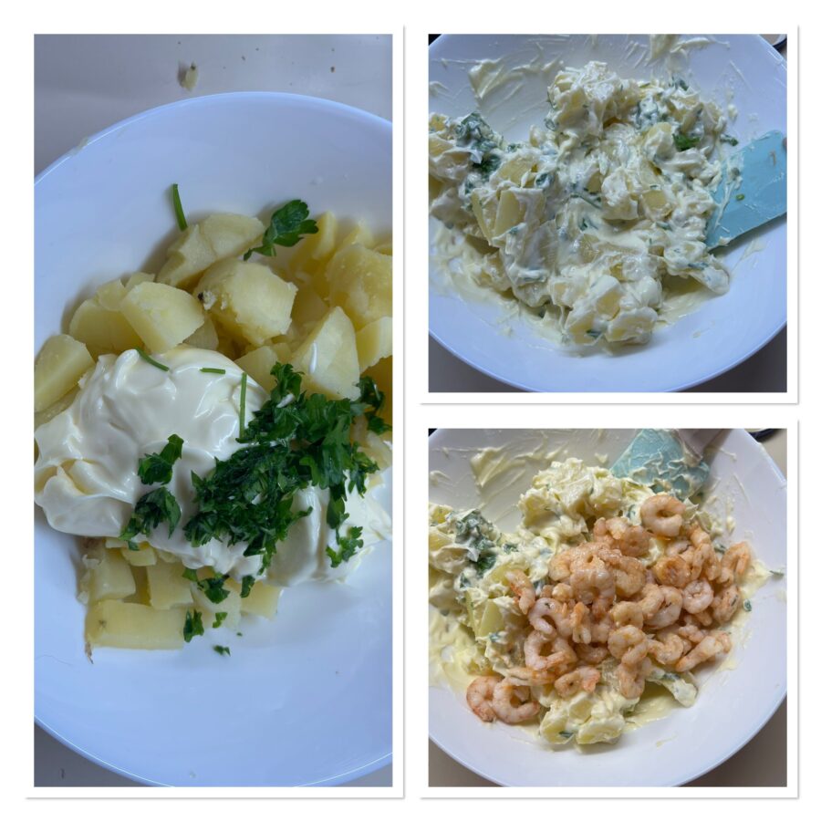 Schil de koude aardappelen en snijd ze in kleine blokjes. Doe ze in een kom samen met de garnalen, meng en voeg de mayonaise toe (zout indien nodig) en een handvol fijngehakte peterselie. Je kunt de mayonaise vervangen door zout, olie en citroensap.