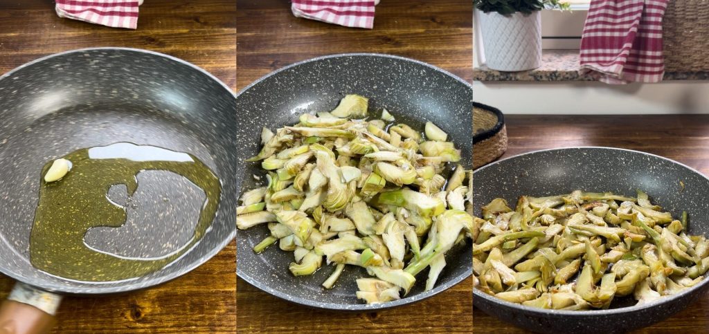 Voeg de artisjokharten toe, breng op smaak met zout en bak ongeveer tien minuten op laag vuur, zonder water toe te voegen tenzij strikt noodzakelijk. Als ze op smaak en goudbruin zijn en gaar, verwijder dan de knoflook en schep ze in een kom.