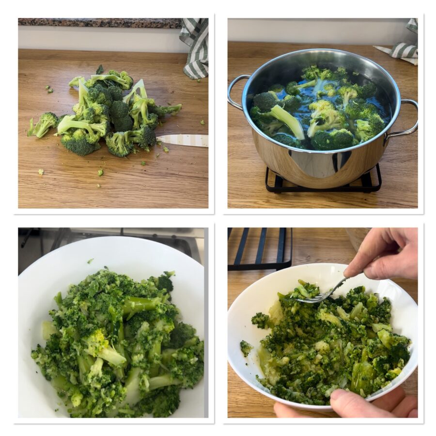 Verdeel de broccoliroosjes van elkaar, verwijder het harde deel van de steel met een mes, spoel ze af en dompel ze in gezouten kokend water. Kook ze tot ze zeer zacht zijn, giet ze vervolgens goed af, doe ze in een kom, laat ze lauw worden en stamp ze goed fijn met een vork.