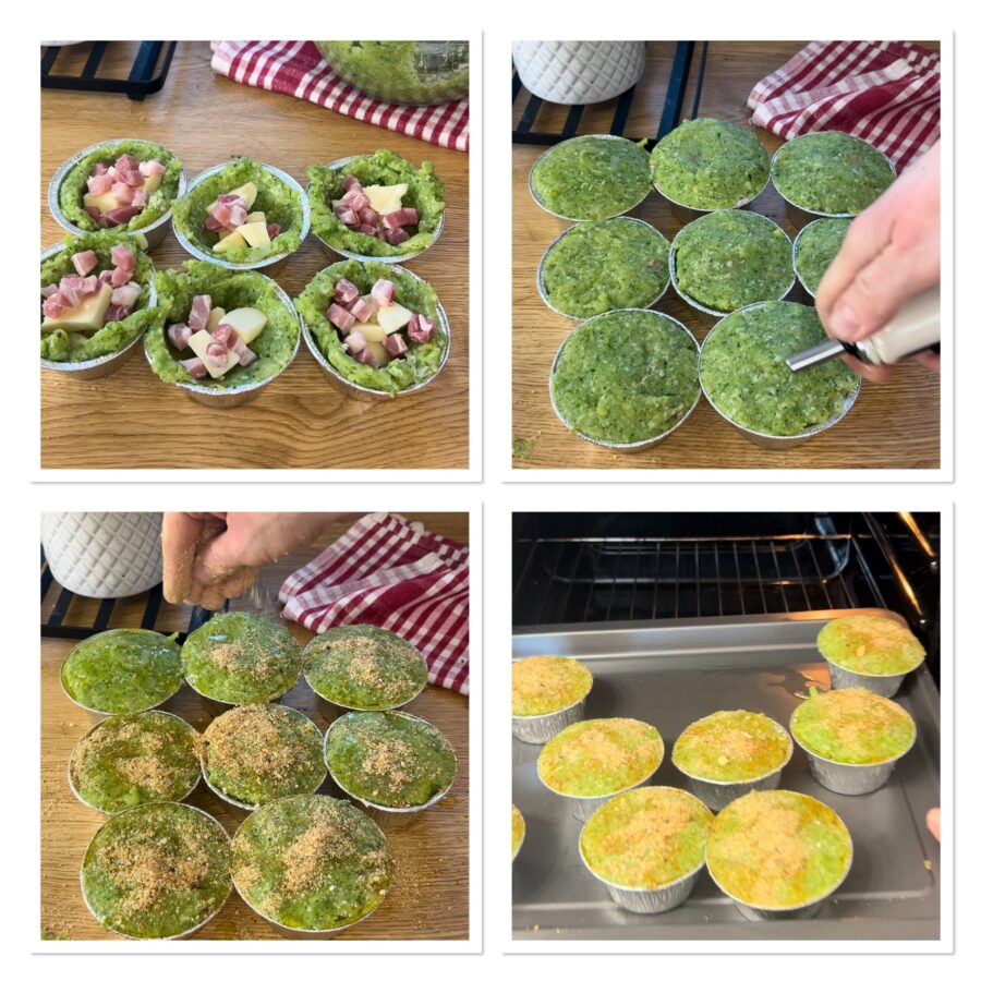 Vet de muffinvormpjes in, bestuif ze met paneermeel en vul ze voor de helft met het mengsel, vul met blokjes kaas naar keuze en wat pancetta en bedek met meer mengsel en strijk goed glad.